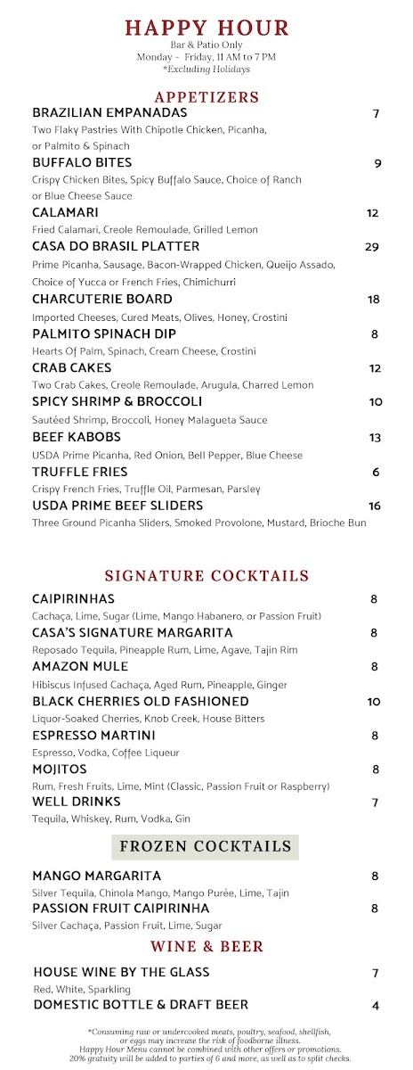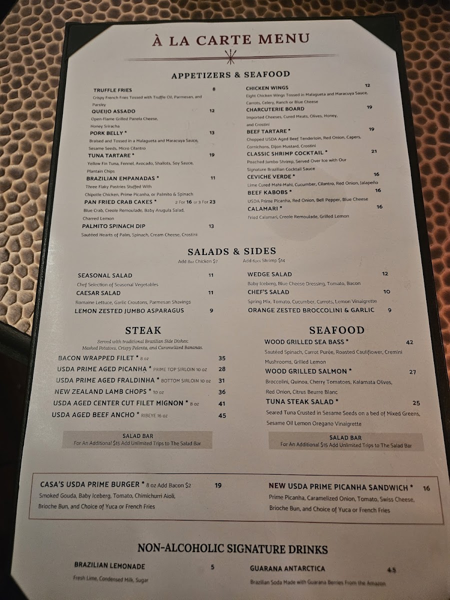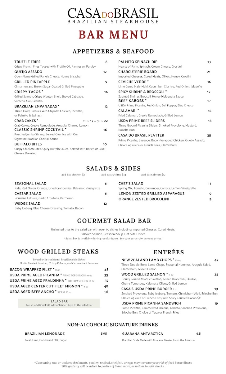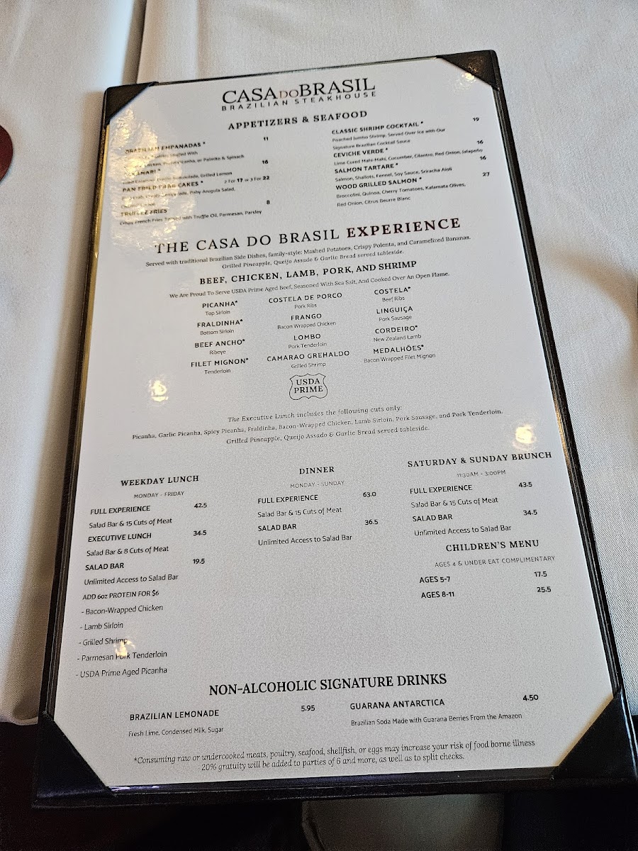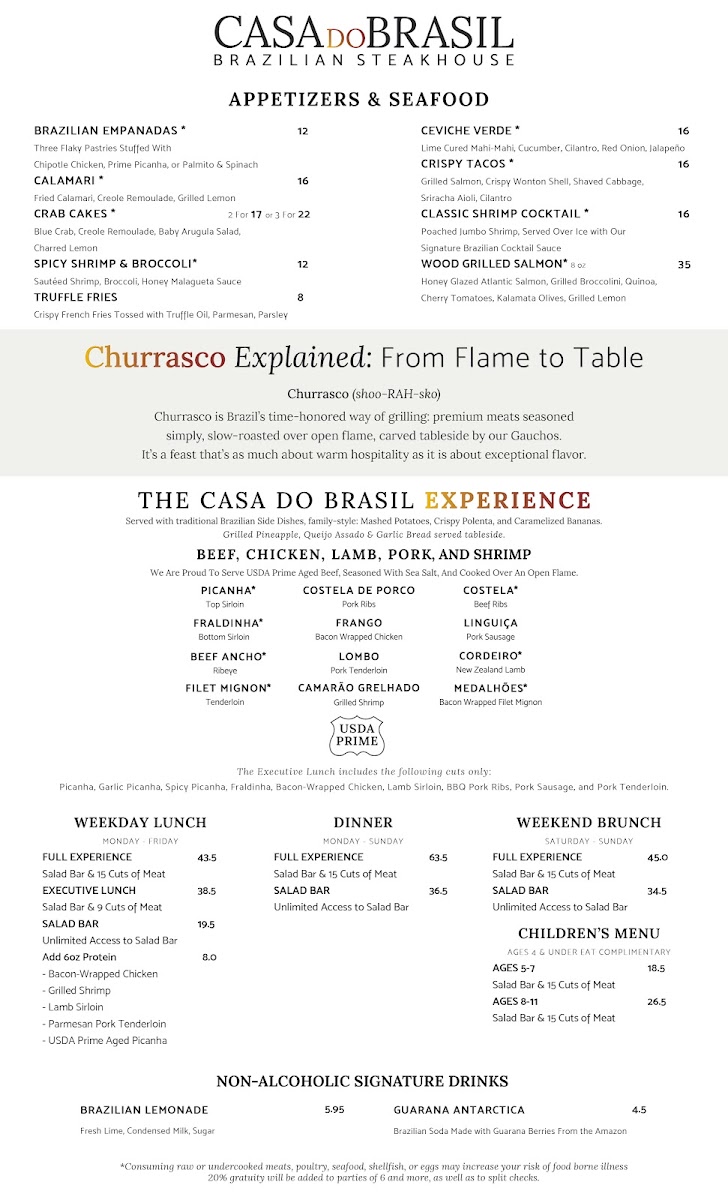 Casa do Brasil offers a menu that reflects the warm and inviting spirit of a traditional Brazilian steakhouse with a modern touch. The menu balances hearty, wood-grilled meats with fresh, vibrant accompaniments, making it suitable for anything from a leisurely lunch to a relaxed evening out.